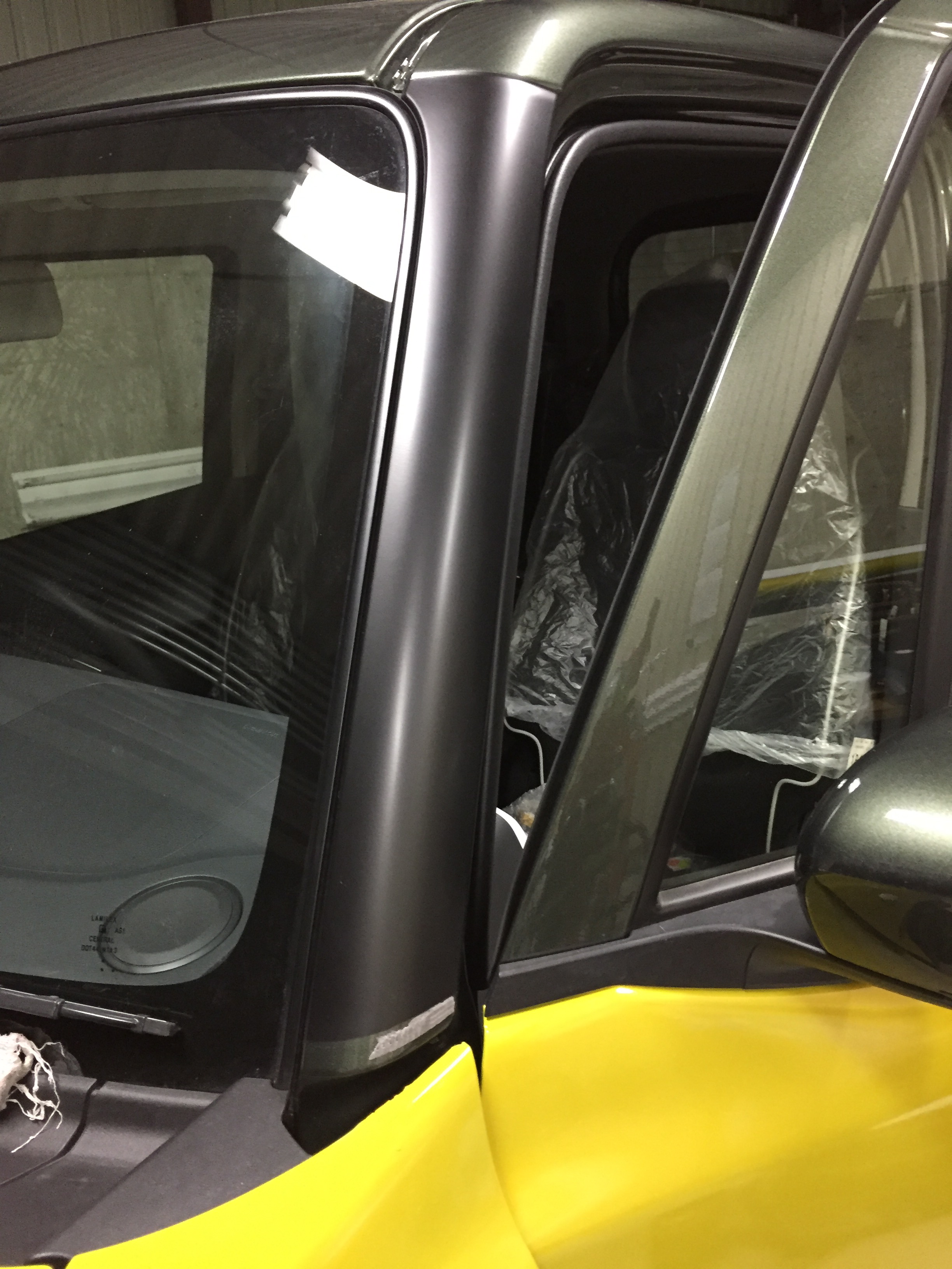 ピラーもイエローと思って貼ってみましたが、こちらは少し安っぽく見えるので却下としました。純正カラーっぽく仕上げたいのでピラー、ドアサッシュは半艶ブラックにしようと思います。次回ご紹介しますね!