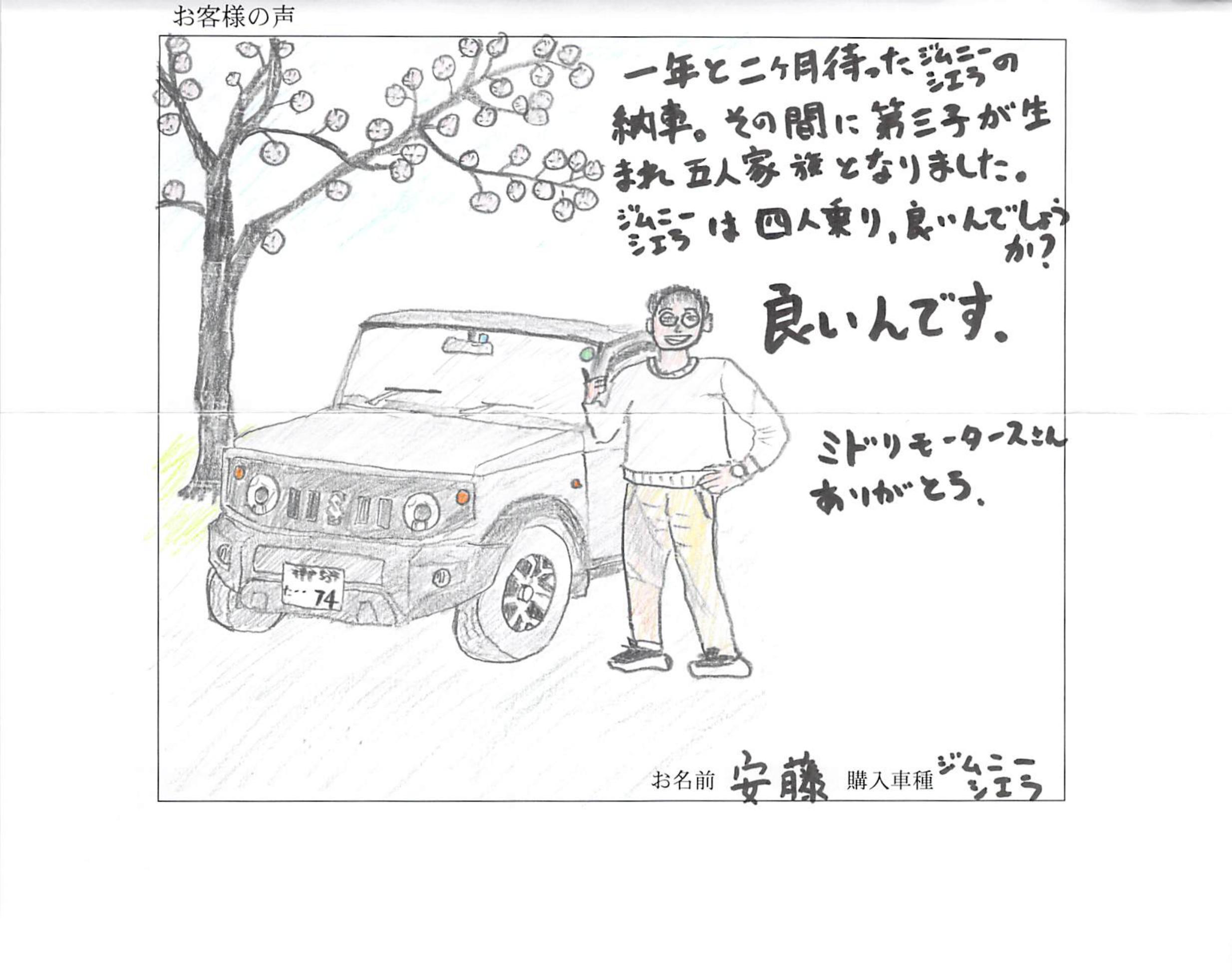 ジムニーシエラご成約のお客様のお声 スズキアリーナ三田 安藤さま、この度はジムニーシエラのご成約ありがとうございました。 ご契約約から1年2ヶ月、ホントにお待たせしました。 そしてご家族が増えたと言う事でおめでとうございます(^-^)☆ そうですね~、4人乗りでちょうどいい感じでしたもんね。大丈夫です、5人になっても ご主人様がお留守番をすれば良いんです! キャンセルせずに、ずっと待っていていただいてありがとうございました。 芦屋からと少し距離はありますが、これからもよろしくお願いします!!
