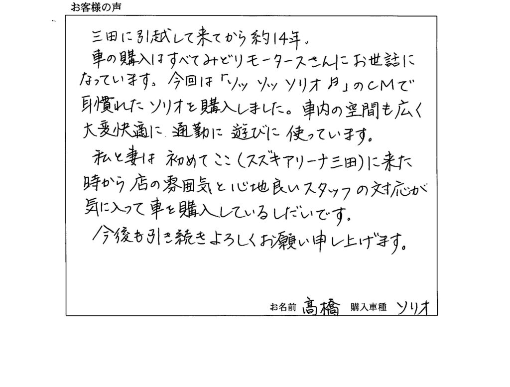 ソリオご成約のお客様のお声 スズキアリーナ三田 高橋様、この度はソリオのご成約ありがとうございます。 昨年にはアルトも買っていただき、ご家族の皆様ともにいつもお世話になっております。 スタッフの対応をお褒めいただきありがとうございます。 これからも元気よく、明るくご対応させていただきますので、今後ともどうぞよろしくお願いします。(ソリオ広いでしょー!)