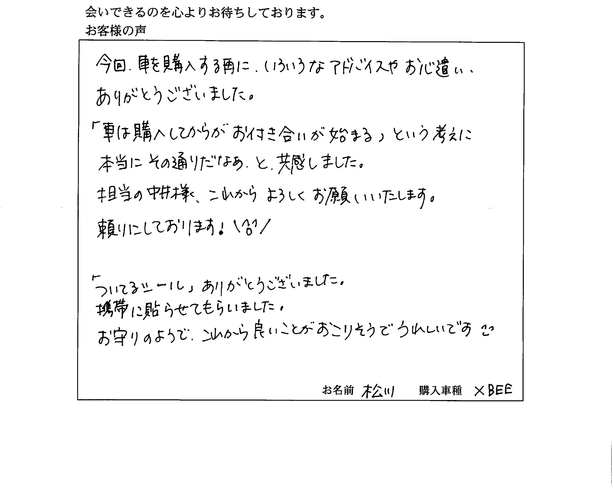 クロスビーご成約のお客様のお声 スズキアリーナ三田 松川様、この度は新色のクロスビーのご成約ありがとうございました。 すごく似合ってますよ! 購入に関しては、一個ずつお悩みを解決したいとの思いです。購入後は、一つも悩みが無いように全力でサポートさせていただければと思っております。 これからのメンテナンス、当店にお任せください(*^^*) 引き続きどうぞよろしくお願いします。