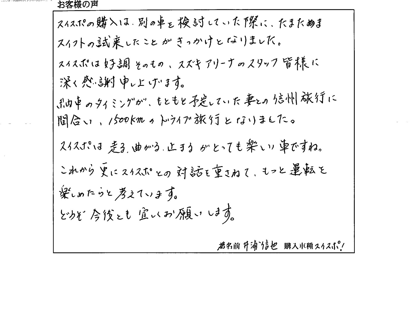 スイフトスポーツご成約のお客様のお声 スズキアリーナ三田 この度はスイフトスポーツのご納車、おめでとうございます!(^^)! 新車での旅行、、、間に合ってよかったです(^^)/ また、車も気に入っていただけたようで嬉しいです(^^♪ これからはメンテナンス等でお役に立てればと思いますので 末永いお付き合いを、よろしくお願い致します(*^^)v