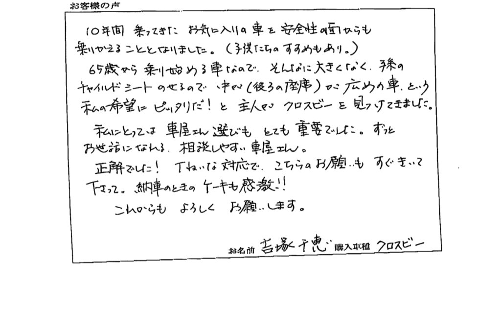 クロスビーをご成約のお客様のお声 スズキアリーナ北神